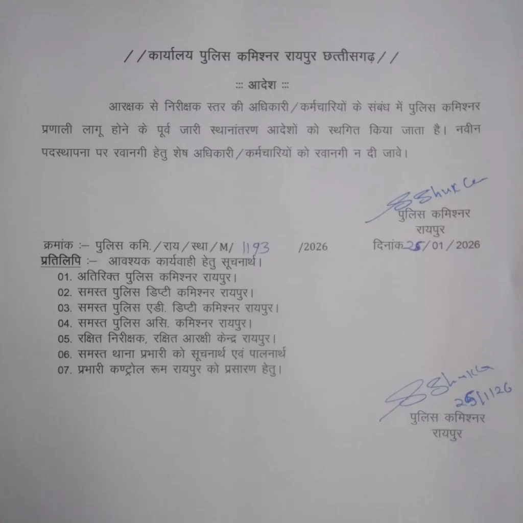 इसके अलावा दर्जन भर अधिकारियों को उनके मातहत एडिशनल सीपी, डीसीपी और एसीपी के तौर पर तैनात किया गया है। सभी पुलिस अफसरों ने पदभार सँभालने के बाद विधिवत अपना कामकाज शुरू कर दिया है। इस बीच रायपुर पुलिस आयुक्त डॉ संजीव शुक्ला ने कमिश्नरी के तहत आने वाले थाना क्षेत्रों को लेकर एक अहम आदेश जारी किया है। उन्होंने आयुक्त प्रणाली लागू होने से ठीक पहले जारी किये गये पुलिस के अफसरों और कर्मचारियों के ट्रांसफर आदेश पर रोक लगा दी है।