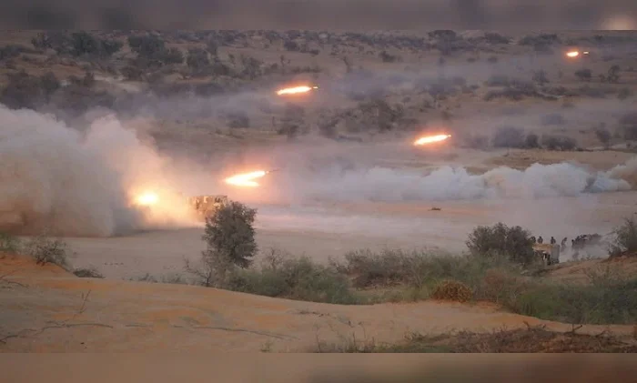 जमीन पर सेना के आधुनिक टैंकों ने अपनी गति और शक्ति का प्रदर्शन किया. रेतीले रेगिस्तान में टैंकों की गर्जना बेहद प्रभावशाली थी. आधुनिक टैंकों ने तेज गति से आगे बढ़ते हुए लक्ष्य पर सटीक गोले दागे. आर्टिलरी यूनिट्स ने लंबी दूरी से सटीक फायर कर दुश्मन की संभावित पोजीशन को ध्वस्त किया. रॉकेट सिस्टम की इंटीग्रेटेड फायरिंग ने युद्धक्षेत्र को नियंत्रित करने की क्षमता का प्रदर्शन किया.